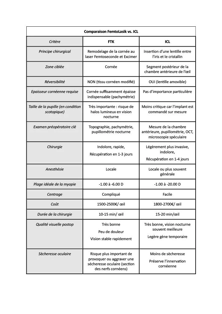 Le choix dépendra de l’anatomie oculaire du patient (épaisseur cornéenne et profondeur de la chambre antérieure), de l’activité professionnelle, des loisirs, des antécédents oculaires et des attentes visuelles.